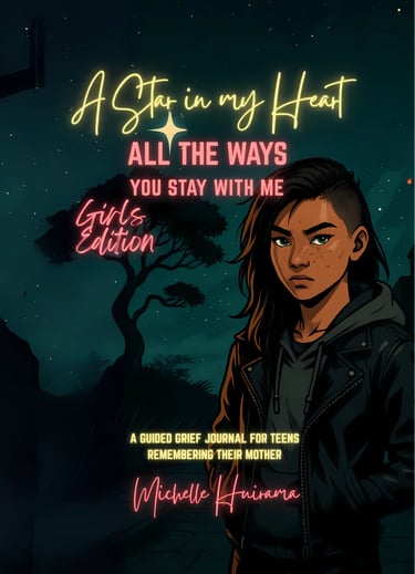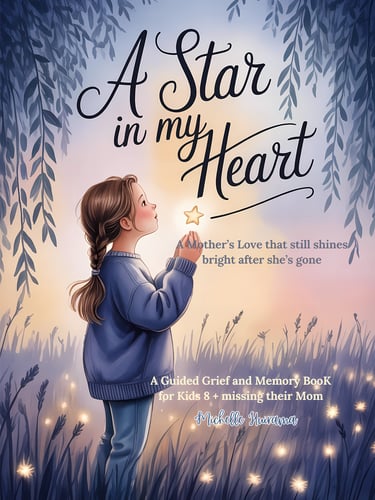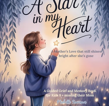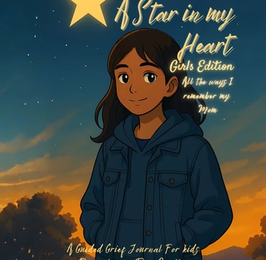 A Star in My Heart – Girls Edition is a comforting grief journal created especially for girls aged 10–13 who are missing their mom. It offers a safe place to write, draw, remember, and gently heal — at a pace that feels right for her.